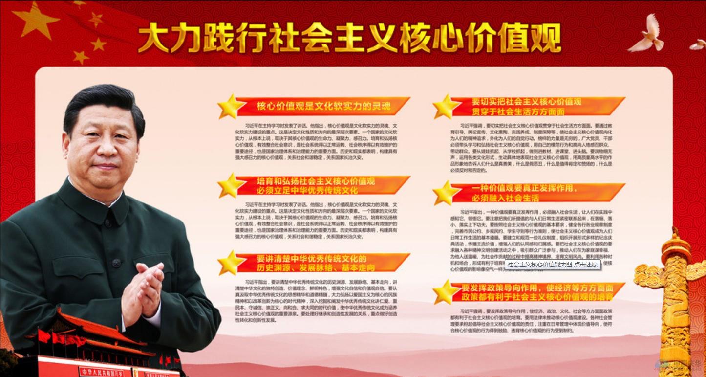 习近平强调,要发挥政策导向作用,使经济、政治、文化、社会等方方面面政策都有利于社会主义核心价值观的培育。要用法律来推动核心价值观建设。各种社会管理要承担起倡导社会主义核心价值观的责任,注重在日常管理中体现价值导向,使符合核心价值观的行为得到鼓励、违背核心价值观的行为受到制约。《 人民日报 》( 2014年02月26日 01 版)